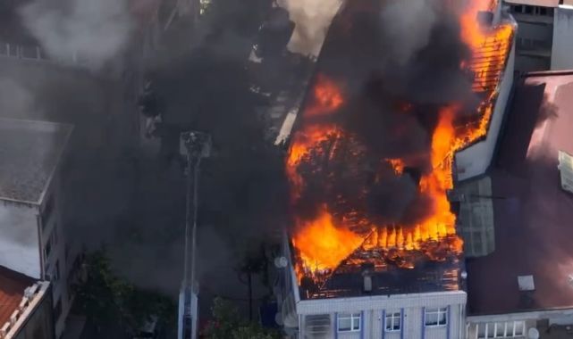 Yangın anına ilişkin yeni görüntüler de ortaya çıktı. Dron ile çekilen görüntülerde alev alev yanan çatı, itfaiye ekiplerinin siyah dumanların arasında müdahale etmesi yer alıyor.