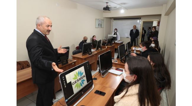 Başkan Büyükgöz’den GESMEK merkezine ziyaret. Gebze Belediyesi’nin eğitim alanındaki öncü hizmetlerinden Güzel Sanatlar ve Meslek Eğitim Kursları (GESMEK)’te ücretsiz kurslar hız kesmeden devam ediyor. 7’den 70’e Gebzelilerin katılım gösterdiği GESMEK kurslarında her sene binlerce kişi hünerlerine hüner katıyor. Tamamı ücretsiz kurslarda usta eğitimcilerin nezaretinde GESMEK çatısı altında eğitimlerine devam eden kursiyerleri ziyaret eden Gebze Belediye Başkanı Zinnur Büyükgöz, çalışmalar hakkında bilgi aldı. Hacı Halil Mahallesi’ndeki GESMEK ana binasını ziyaret eden Gebze Belediye Başkanı Zinnur Büyükgöz; Hüsn-i Hat, Ebru, Bağlama, İngilizce, Genel Muhasebe, Arapça ve Resim sınıflarını gezdi. GESMEK’li kursiyerlerle dersler ve ilgi alanları hakkında sohbet eden Gebze Belediye Başkanı Zinnur Büyükgöz, usta öğreticilerden de müfredat hakkında hasbihal etti. Başkan Büyükgöz tüm kursiyerlere eğitim hayatlarında başarılar diledi.