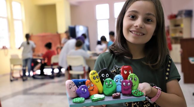 Kocaeli Büyükşehir Belediyesi Gençlik ve Spor Hizmetleri Dairesi Başkanlığı’nın ilk ve ortaokul öğrencilerine hizmet veren Bilgievleri yaz etkinlikleri kapsamında minikleri taş boyama sanatıyla tanıştırıyor. Taşlara hayallerini yansıtan Bilgievi öğrencileri aynı zamanda el becerilerini geliştiriyor.