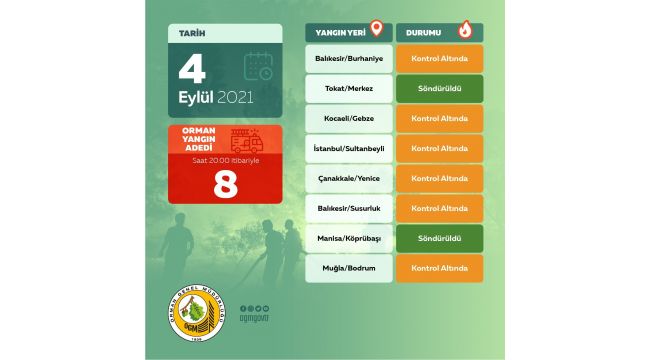 4 Eylül itibariyle Balıkesir; Burhaniye ve Susurluk, Kocaeli, İstanbul, Çanakkale ve Muğla’da meydana gelen orman yangınlarının kontrol altında olduğunun belirtildiği paylaşımda, Tokat ve Manisa’da çıkan orman yangınının tamamen söndürüldüğü aktarıldı.