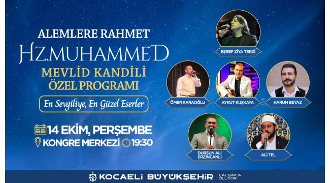Kocaeli Büyükşehir Belediyesi, Peygamber Efendimiz Hz. Muhammed’in (S.A.V) doğum günü olan Mevlid Kandili münasebetiyle 14 Ekim Perşembe günü özel bir program düzenleyecek. “En Sevgiliye İthafen En Güzel Eserler” adı altında düzenlenecek olan Mevlid Kandili Özel Programı, Kocaeli Büyükşehir Belediyesi Kongre Merkezi’nde 19.30’da başlayacak.