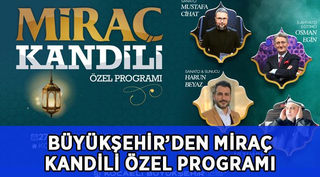 Miraç, Yüce Peygamberimiz (S.A.V)'in Cenab-ı Allah’ın yüksek huzuruna kabulüdür. Onun şahsında insanlığın önüne açılan sınırsız terakki yolculuğu olan gece için Büyükşehir Belediyesi, anma programı düzenledi. Kocaeli Büyükşehir Belediyesi, Hz. Muhammed’in (S.A.V) Allah’ın huzuruna yükseldiği gece olarak kabul edilen Miraç Kandilini özel bir program ile anacak. Tüm vatandaşların davet edildiği Miraç Kandili Özel Programı, Kongre Merkezi’nde gerçekleştirilecek, 27 Şubat Pazar akşamı saat 19.30’da başlayacak.