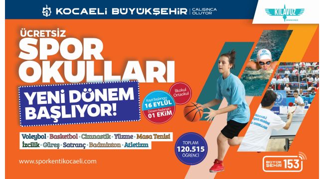 Kocaeli Büyükşehir Belediyesi’nin ilkokul ve ortaokul öğrencilerin bedenen ve ruhen sağlıklı bir birey olmaları için gerçekleştirileceği Ücretsiz Kış Dönemi Spor Okulları için kayıtlar almaya devam ediyor. Eğitimlerin 1 Ekim Salı günü başlayacağı Spor Okulları 10 farklı branşı kapsıyor.