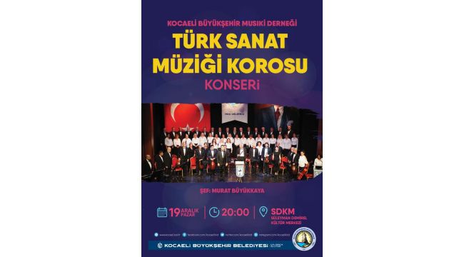 Kocaeli Büyükşehir Musiki Derneği Türk Sanat Müziği Korosu, 19 Aralık Pazar akşamı konser verecek. Şef, Murat Büyükkaya yönetimindeki konser, SDKM Büyük Sahne’de 20.00’da başlayacak.