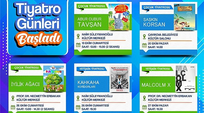 19-27 Ekim Tarihleri arasında gerçekleşecek olan tiyatro günlerinin ilk haftasında 26 Ekim Cumartesi günü Prof. Dr. Necmettin Erbakan Kültür Merkezi’nde 13.00-14.30 saatlerinde “İyilik Ağacı” isimli çocuk tiyatrosu, saat 19.30’da Naim Süleymanoğlu Kültür Merkezi’nde “Kahkaha Koridorları” isimli yetişkin tiyatrosu ve 27 Ekim Pazar günü de saat 19.30’da Prof. Dr. Necmettin Erbakan Kültür Merkezi’nde “Malcolm X” isimli yetişkin tiyatrosu sahne alacak.