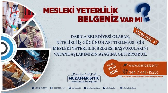 Darıca Belediyesi, Mesleki Yeterlilik Kurumu iş birliğiyle iş gücü piyasasına mesleki yeterlilik belgesine sahip kalifiye personel kazandıracak. Darıca Belediyesi tarafından ilçede nitelikli işgücünün arttırılması amacıyla 5544 sayılı Mesleki Yeterlilik Kurumu Kanunu ve Sosyal Güvenlik Bakanlığı tarafından belirlenen ve belge alma zorunluluğu olan bazı meslek branşları için başvuru merkezi oluşturuldu. Mesleki yeterlilik belgesine sahip olmayan kişiler, www.darica.bel.tr adresinden online olarak başvuru yaparak ücretsiz olarak belgelendirme sınavı için kayıt oluşturabilecekler. Başvuran kişiler sınavda başarılı olmaları durumunda devlet tarafından desteklenen mesleki yeterlilik belgesi almaya hak kazanacak.