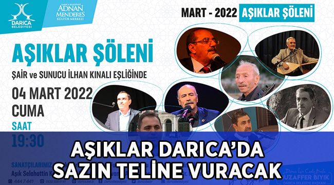Türk kültürünün önemli bir parçası olan aşıklık geleneğinin yaşatılması amacıyla kültürel etkinlikler kapsamında Darıca Belediyesi tarafından “Aşıklar Şöleni” düzenleniyor. Adnan Menderes Kültür Merkezi’nde 4 Mart Cuma günü saat 19.30’da şair ve sunucu İlhan Kınalı eşliğinde düzenlenecek olan ‘Aşıklar Şöleni’ne bölgemizin tanınmış halk ozanlarından Aşık Nuri Çırağı, Aşık Fuat Çerkezoğlu, Aşık Sıtkı Eminoğlu, Aşık Selahattin Kazanoğlu, Aşık Cemal Divani, Aşık Taner Öztürkoğlu ve Dr Hikmet Çığlık katılacak.