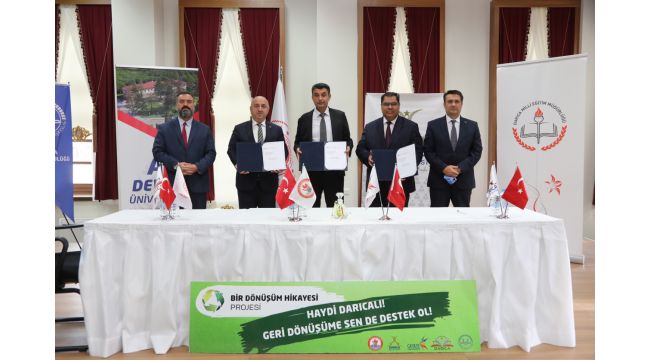 Darıca’da doğal varlıkların korunması, sürdürülebilir çevre bilincinin oluşturulması, çevre dostu tüketim alışkanlıklarının kazandırılması ve atık yönetimi konularında farkındalık oluşturulması amacıyla “Bir Dönüşüm Hikayesi” projesi başlatıldı. Darıca Kaymakamlığı, Darıca Belediyesi ve Gebze Teknik Üniversitesi işbirliğinde Darıca İlçe genelinde atıkların toplanması ve geri dönüşüme kazandırılması ile ilgili farkındalık bilincini oluşturmayı hedefleyen ‘’Bir Dönüşüm Hikayesi’’ projesinin tanıtım toplantısı düzenlenen törenle gerçekleştirildi. Darıca Kaymakamlığı’nda gerçekleştirilen törende; Darıca Kaymakamı Yüksel Kara, Darıca Belediye Başkanı Muzaffer Bıyık, GTÜ Rektörü Prof. Dr. Muhammet Hasan Aslan, Darıca İlçe Milli Eğitim Müdürü İsmail Oğuz ve Darıca Müftüsü Zeynel Abidin Çınar projeye imza atarak start verildi.