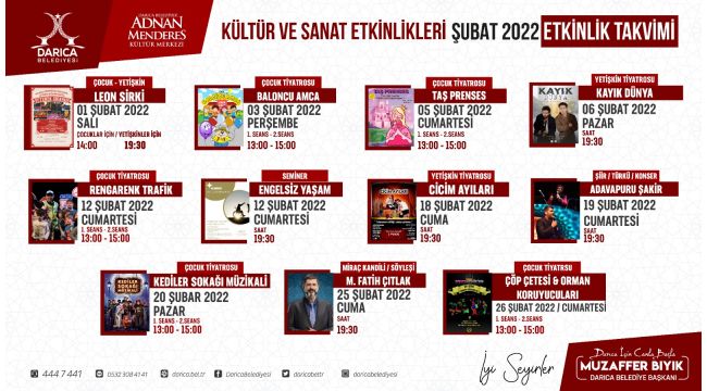 Darıca Belediyesi Adnan Menderes Kültür Merkezi Şubat ayı kültür sanat etkinlikleri takvimi açıklandı. Genç yaşlı 7'den 70'e herkese hitap edecek programların yer aldığı etkinlikler, Darıcalılara keyifli anlar yaşatacak. Kültür sanat etkinliklerinde özellikle çocuklar tiyatroya adeta doyacaklar.