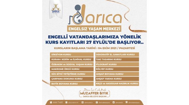 Engelli bireylerin sosyal yaşamına katkı sağlamak ve bireysel yönlerini geliştirmek amacıyla başlatılan kurslarda engellilerin topluma kazandırılması amaçlanıyor. Darıca Engelsiz Yaşam Merkezi’nde diksiyon kursu, Kuran-ı Kerim ve ilmihal kursu, Özbakım ve sosyal yaşam kursu, makrome örgü kursu, süs bitki yetiştirme kursu, çarpana dokuma kursu, batik boyama kursu, dekoratif el sanatları kursu, takı tasarımı kursu, filografi kursu, rölyef kursu, ahşap boyama kursu, ahşap yakma kursu, keçe ve aksesuar hazırlık kursu gibi 14 farklı branşta eğitim verilecek. Kayıtlar için Adnan Menderes Kültür Merkezi’nde bulunan Darıca Engelsiz Yaşam Merkezi’ne başvurulacağı belirtilirken 444 7441 numaralı telefondan detaylı bilgi alınabileceği ifade edildi.
