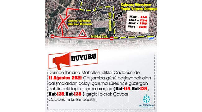 Kocaeli Büyükşehir Belediyesi iştiraklerinden İSU Derince ilçesi İbni Sina Mahallesi İstiklal Caddesi’nde çalışma yapılacak. Yaklaşık 2 ay sürecek çalışmada vatandaşların sorun yaşamaması için Ulaşım Dairesi Başkanlığınca alternatif güzergah oluşturuldu.