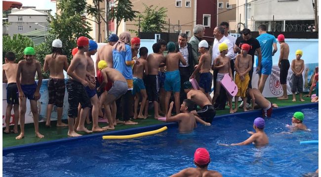 Dilovası Belediyesi ve dilovası İlçe Gençlik ve Spor Müdürlüğü tarafından geçtiğimiz Haziran ayında başlayan Yaz Spor Okulları kapsamında sürdürülen eğitimlere bir yenisi daha eklendi. Dilovası Mehmet Akif Ersoy İmam Hatip Lisesi bahçesine kurulan portatif yüzme havuzunda çocuklar uzman yüzme hocaları eşliğinde yüzme dersleri almaya başladılar. Yüzme derslerinin açılışında renkli görüntüler yaşanırken çocuklar havuzun keyfini doyasıya yaşadılar.YÜZME BİLMEYEN ÇOCUK KALMAYACAK