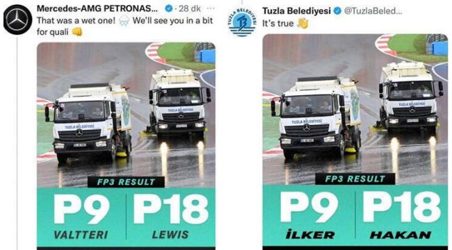 Mercedes-AMG PETRONAS'ın Formula 1 resmi hesabı, kendi pilotlarının antrenman sonuçlarını Tuzla Belediyesi'nin araçlarının fotoğrafıyla . Mercedes, iki temizlik aracının altına pilotları Valtteri Bottas ile Lewis Hamilton'un isimlerini yazdı.