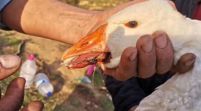 Gelişigüzel atılan misina kancaları kazın diline ve sırtına takıldı