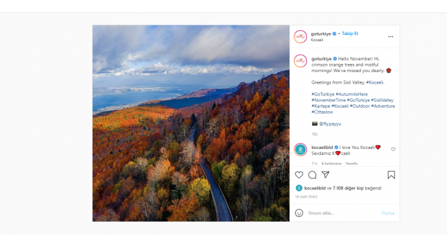 Kültür ve Turizm Bakanlığı’nın Türkiye’nin tanıtımı için kurduğu goturkiye instagram sayfasında yapılan Kartepe Sisli Vadi paylaşımı, katılımcılardan beğeni aldı