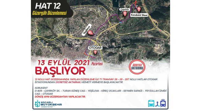 12 No’lu hat güzergahında yapılan düzenleme ile Korukent’ten çıkan araç D-605, Çayırköy Sokak, Turan Güneş Caddesi, Yeşilova, Kireç Ocakları, Seymen Sapağı, Feyzullah İzmidi Caddesini takip ederek otogara ulaşacak. Vatandaşlar Otogar istasyonundan ücretsiz olarak aktarma yapabilecek. Buradan isteyen vatandaşlar tramvaya veya 26, 28 ve 29T No’lu hatlara ücretsiz binebilecek.