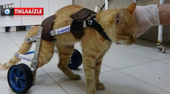 Kocaeli’de arabanın çarpmasıyla arka iki bacağı felç kalan ve yürüyemeyen kediye, özel yürüteç yapıldı. Yeniden hayata tutunan kedi şimdilerde koşuyor.