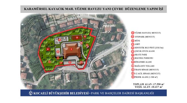 Kocaeli Büyükşehir Belediyesince inşa edilen ve geçtiğimiz yıllarda hizmete alınan Karamürsel Yarı Olimpik Kapalı Yüzme Havuzunun yanında bulunan alanda çevre düzenlemesi yapılacak. Park ve Bahçeler Dairesi Başkanlığınca 17 bin 590 metrekare alanda yapılan çalışmalar kapsamında gençler için yeni eğlence alanları oluşturulacak.