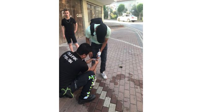 Darıca ilçesinde seyir halindeyken motosikletten düşen gencin yardımına bölgede devriye atan trafik polisi koştu.