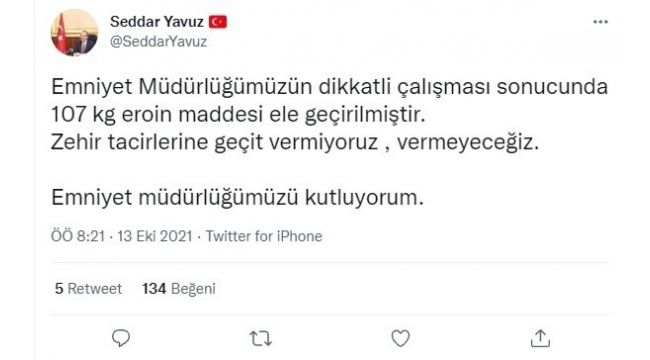 Zehir tacirlerine geçit vermiyoruz, vermeyeceğiz. Emniyet müdürlüğümüzü kutluyorum" ifadelerini kullandı.