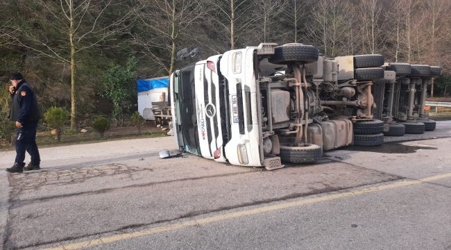 Kocaeli'de Yuvacık Barajı yolu üzerinde sürücüsünün hakimiyeti kaybetmesiyle tır yola devrildi. Tırın içinde sıkışan sürücüyü itfaiye ekipleri çıkarıp sağlık ekiplerine teslim etti.