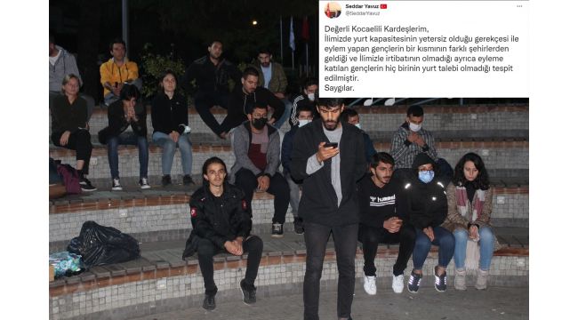 Kocaeli’nin İzmit ilçesinde yurtların yetersiz olduğunu iddia eden bir grup genç, eylem başlattı. Konu ile ilgili Kocaeli Valisi Seddar Yavuz, sosyal medya hesabından paylaşım yaparak, eylem yapan gençlerin hiçbirinin yurt başvurusunda bulunmadığı ve bazı eylemcilerin Kocaeli ile ilişkilerinin olmadığını açıkladı. Vali Yavuz, konu ile ilgili yaptığı açıklamada, “Değerli Kocaelili Kardeşlerim, İlimizde yurt kapasitesinin yetersiz olduğu gerekçesi ile eylem yapan gençlerin bir kısmının farklı şehirlerden geldiği ve İlimizle irtibatının olmadığı ayrıca eyleme katılan gençlerin hiçbirinin yurt talebi olmadığı tespit edilmiştir” ifadelerine yer verdi.