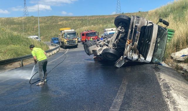 Kontrolden çıkan tır yan yattı: Kimyasal madde yola saçıldı