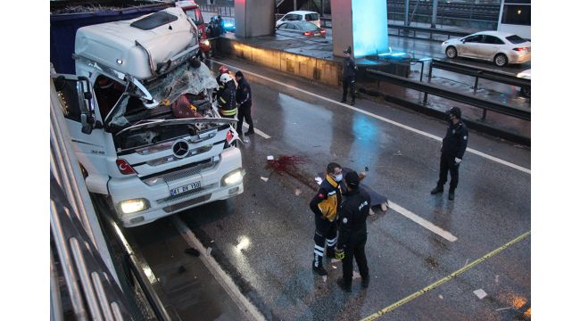Olay, İzmit ilçesi D-100 Karayolu İstanbul istikameti halkevi mevkiinde meydana geldi. M.Ü. (22) isimli genç, Adnan Menderes üst geçidinden yola atladı. Araç sürücüleri, şahsı ezmemek için ani fren yaptı. Bu esnada İstanbul istikametine gitmekte A.C. yönetimindeki 41 DV 150 plakalı Mercedes marka tır, önünde Duran T. K. idaresindeki demir yüklü 41 HT 050 plakalı Scanıa marka tıra arkadan çarptı. A.C. tırda sıkışırken, durumu gören vatandaşların ihbarı üzerine olay yerine sağlık, polis ve itfaiye ekipleri sevk edildi. Kısa sürede olay yerine gelen itfaiye ekipleri tarafından tır sürücüsü A. C.'yi sıkıştığı yerden çıkarılarak sağlık ekiplerine teslim edildi. Yaralı tır sürücüsü hastaneye kaldırılırken köprüden düşen ve üstünden araç geçen M.Ü. ise olay yerinde hayatını kaybetti. Kaza sebebiyle yol uzun süre trafiğe kapalı kaldı.