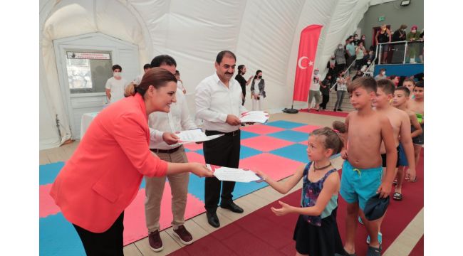 Tepeköy Mahallesi’ndeki İzmit Belediyesi Kapalı Yüzme Havuzu’nda düzenlenen sertifika törenine İzmit Belediye Başkanı Fatma Kaplan Hürriyet’in yanı sıra Başkan Yardımcısı Nurettin Bulut ve Spor İşleri Müdürü Mithat Ağa katılırken aileler de çocuklarını bu gururlu günlerinde yalnız bırakmadı. Başkan Hürriyet, yüzme kursunu tamamlayan yüzücülere sertifikalarını tek tek takdim etti.