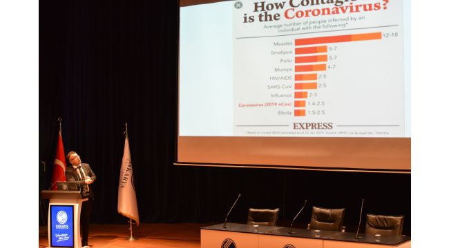 Küresel bir salgına yol açan Korona virüs konusunda öğrencilerin ve personelin bilgilenmesi amaçlanan toplantıda konuşan Rektör Yardımcısı Prof. Dr. Temel Gürdal, Sakarya Üniversitesi olarak Korona virüs konusunda önlemlerini aldıklarını ifade etti. Prof. Dr. Gürdal, Türkiye’de virüsün henüz görülmediğini belirterek, virüsün yaygın olduğu ülkelerden gelen öğrencilerle ile ilgili de bir takım tetkiklerin ve tedbirlerin alındığını söyledi. Prof. Dr. Oğuz Karabay, virüsün dış ortamlara dayanıklılığı, maske kullanımı ve algı yönetimi konularına değinerek, Korona kaynaklı ölümlerin SARS ve MERS virüslerine göre düşük olmasına rağmen Korona virüsünün çok hızlı yayıldığını, bu nedenle korku ve paniğe neden olduğunu vurguladı. Sakarya’da şu ana kadar tanı konmuş hiçbir vak'a olmadığını belirten Karabay, SAÜ Eğitim ve Araştırma Hastanesi Enfeksiyon Kliniğinin Türkiye’de seçilmiş 25 merkezden bir tanesi olmasının Sakarya Üniversitesi adına övünülecek bir durum olduğunu dile getirdi.