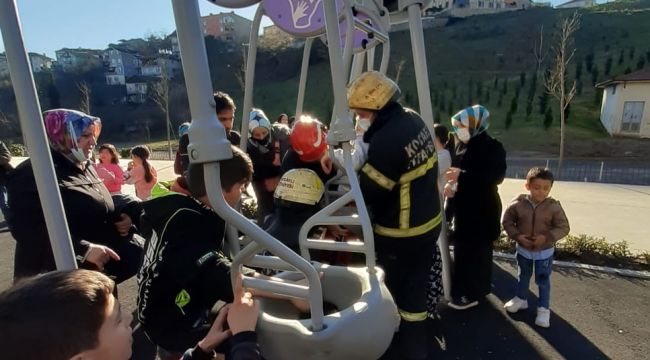 Kocaeli’nin Derince ilçesinde parka giden 9 yaşındaki çocuk salıncağın oturağına sıkıştı. İtfaiye ekipleri, salıncağı keserek sıkışan çocuğu kurtardı.