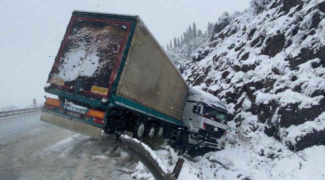 Kocaeli’nin Körfez ilçesi TEM Otoyolu’nda sürücüsünün direksiyon hakimiyetini kaybettiği tır yoldan çıktı. Demir bariyerleri kıran tır, yolun kenarında asılı kaldı.