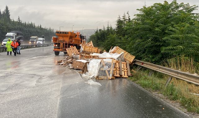 TEM Otoyolu'nda seramik yüklü tırın kasası devrildi