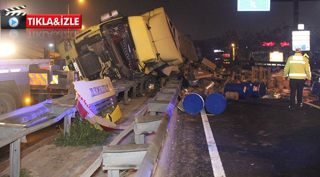 Kocaeli'de sürücüsünün direksiyon hakimiyetini kaybettiği tır, bariyerlere çarparak durabildi. Dorsede bulunan variller yola saçıldı, tır ise kullanılamaz hale geldi.