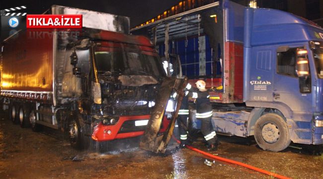 Kocaeli'de park halindeki tırın kupasında çıkan yangın, başka bir tırın brandasına sıçradı. Yangın itfaiye ekipleri tarafından kontrol altına alınırken, alev alev yanan tırı görünce panikle dışarıya çıkan vatandaşlar ise o anları saniye saniye kaydetti.