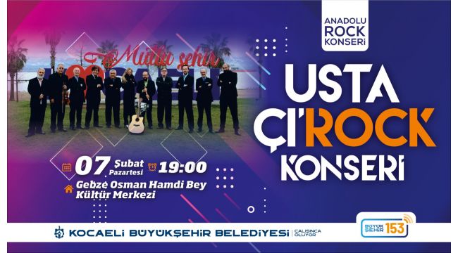 Kocaeli Büyükşehir Belediyesi Usta Çı’rock isimli Anadolu Rock grubu konserini vermeye hazırlanıyor. 60 yaş üzeri ve genç üyelerin harmanlandığı grupta hafızalara kazınmış türküler seslendirilecek. Gebze Osman Hamdi Bey Kültür Merkezinde gerçekleşecek konser 7 Şubat Pazartesi günü saat 19.00’da müzikseverler ile buluşacak. Usta Çı’rock konserleri 12 ilçede müzikseverlerle buluşacak. Gebze’den sonra Usta Çı’rock grubu performansını Gölcük Kazıklı Kervansaray Kültür Merkezi’nde 21 Şubat tarihinde saat 19.30’da sahneleyecek.