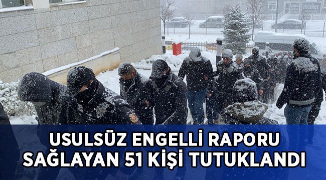 Edinilen bilgiye göre, usulsüz olarak engelli sağlık kurulu raporu ile rüşvet karşılığı iş göremezlik-istirahat sağlık raporu alınmasını sağlayan, 3 doktor, 2 hemşire ve eczacının da aralarında bulunduğu toplam 93 şüpheli; Kocaeli ile birlikte İstanbul, Sakarya, Tokat, Düzce ve Samsun'da düzenlenen eş zamanlı operasyonda yakalanarak gözaltına alındı. Yapılan aramalarda ruhsatsız tabanca, kuru sıkı tabanca, suça konu yazışmaların bulunduğu ajandalar ile çok sayıda ilaç ele geçirildi. Emniyette ifade işlemleri biten 26 şüpheli serbest bırakılırken, 67 şüpheli ise Gebze Adliyesi’ne sevk edildi.