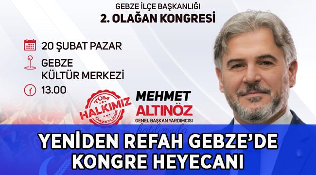 Milletimizle omuz omuza 3 yaşına girdik. 200 bine yakın resmi üye 350 bin ıslakimzalı üyesiyle ülkemizin huzura ve refaha kavuşması için ilk günkü aşk ve heyecanla 2. Olağan kongremizi yapacağız. Yeniden Refah Partisi'nin 2. Olağan kongremizi 20 Şubat Pazar günü "Hazırız" sloganıyla Gebze Kültür Merkezinde gerçekleştireceğiz. “Yaşanabilir bir Türkiye için, yeniden büyük Türkiye için, yeni ve adil bir dünya için , herkesin refahı ve adaleti için, 'Burada bereket var' diye haykırmak için, tüm Gebzeli Hemşerilerimizi kongremize davet ediyoruz..