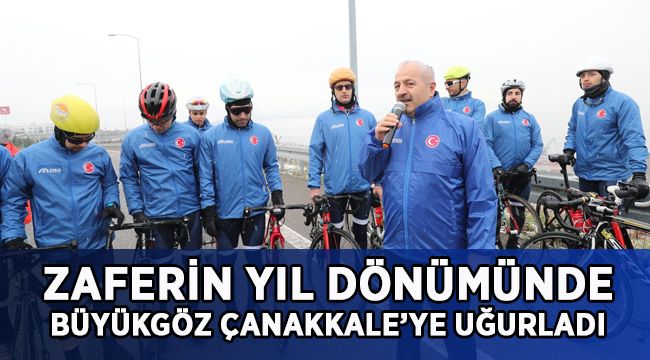 Aziz şehitlerimizi hatıratına saygı ve kahramanlarımızı anmak üzere düzenlediğimiz ve Çanakkale Şehitler Abidesinde noktalanacak olan bisiklet turuna katılan siz değerli sporcu kardeşlerimize şükranlarımı sunuyorum. Yolunuz açık olsun rabbim kazasız belasız varmayı nasip etsin inşallah” dedi. Konuşmanın ardından Başkan Büyükgöz vatan toprağı ve Türk bayrağını Çanakkale Şehitliğine ulaştırmak üzere sporculara teslim etti. Törenin ardından bisiklet konvoyu Çanakkale’ye doğru yola çıktı.